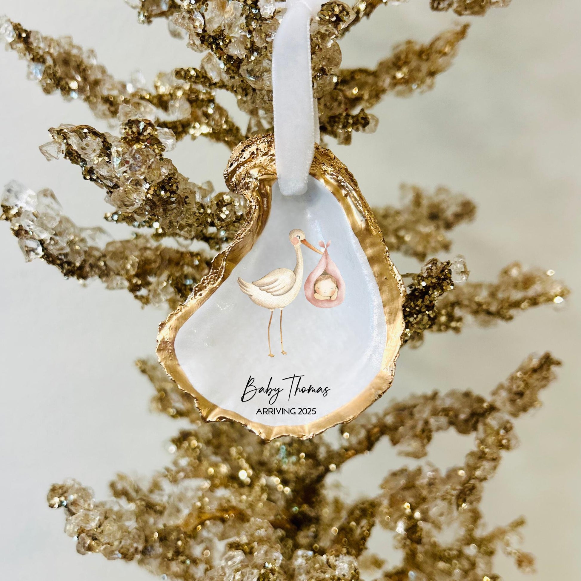 This customizable oyster shell ornament is the perfect gift to announce your new baby! All of our oyster shell ornaments are handmade to your specifications. A truly unique gift you can enjoy and remember every holiday to come!